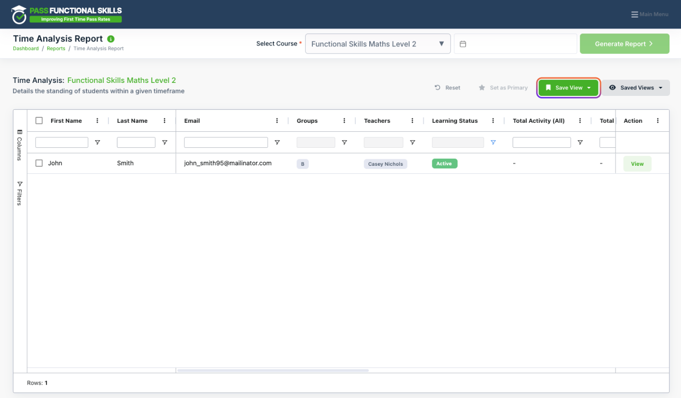 1. Visit a table which has the Saved Views feature (e.g. the Time Analysis Report).