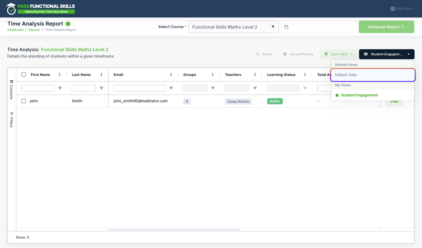 To switch between Views, choose them from the Views dropdown: Default is the table without any changes. Notice that there is a star besides Student Engagement. This is because it is the Primary view and shows whenever you first visit this page.
